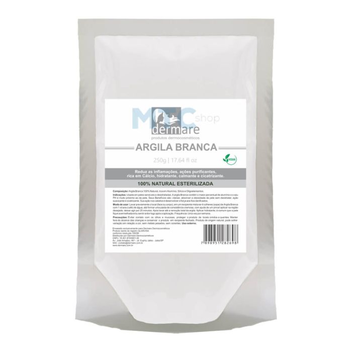A argila branca da marca dermare possui o pH próximo ao da pele, sua principal função é realizar o clareamento da pele e absorver a oleosidade sem desidratar a região aplicada. Além de atuar na pele a argila branca possui substâncias que auxiliam na manutenção dos cabelos e fortifica os fios danificados. Características: