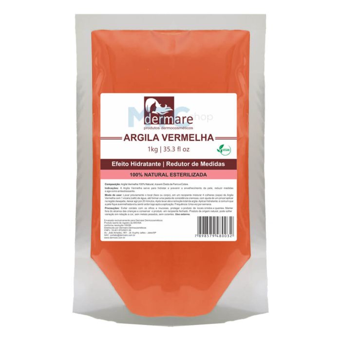 A argila vermelha da marca Dermare é rica em cobre e óxido de ferro é utilizada para a prevenção e manutenção da pele e das células envelhecidas. Por conta dos seus compostos a argila vermelha tem ação hidratante e tem ótimos resultados na redução de medidas. Características: