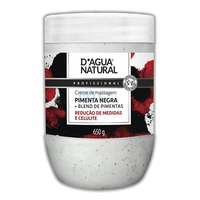 O creme de massagem pimenta negra foi desenvolvido pela empresa DAgua natural e está disposto em embalagem plástica com 650g. Indicado para massagem modeladora e para redução de medidas, possui ativos que estimulam a circulação da região, ativam os neurotransmissores presentes na pele que melhoram a permeação do creme, transmite uma sensação de aquecimento local e potencializa os resultados. Características: