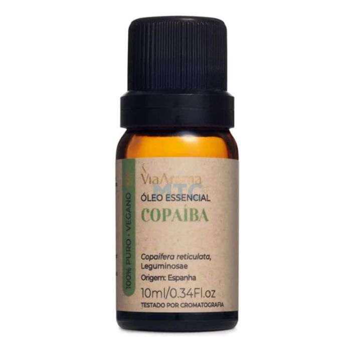 O óleo essencial de Copaíba é produzido pela empresa Via Aroma e está disposto em um frasco de vidro contendo 10ml. O óleo essencial de Copaíba, possui ação anti-inflamatória, antisséptico e cicatrizante natural. Indicado para acelerar o processo de recuperação dos tecidos, regenera a pele ferida, atua em acnes e diferentes lesões na pele. Características: