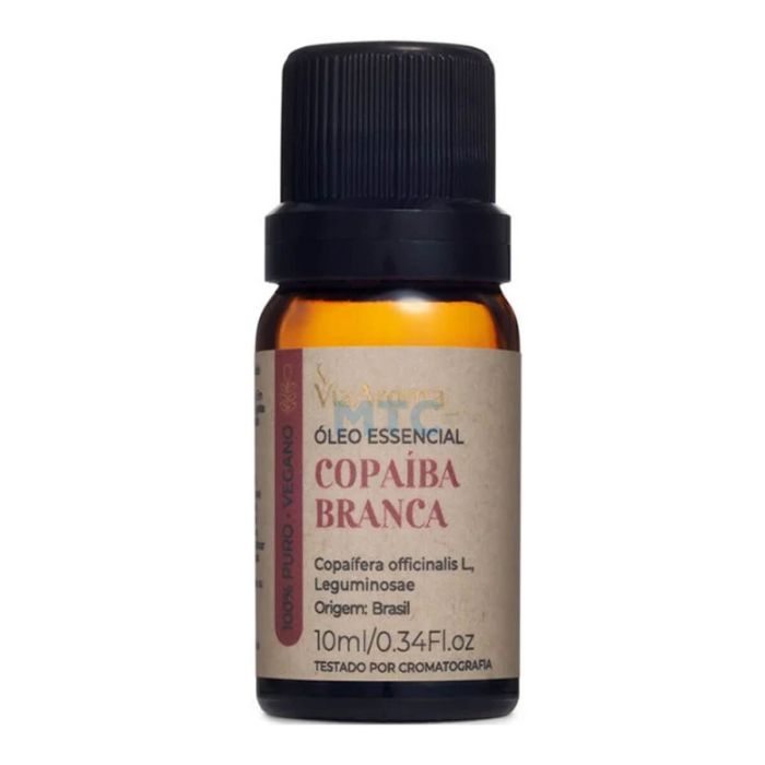 O óleo essencial de Copaíba Branca é produzido pela empresa Via Aroma e está disposto em um frasco de vidro contendo 10ml. O óleo essencial de Copaíba Branca, possui ação antioxidante, previne o envelhecimento precoce da pele, reduz manchas e evita a formação de rugas prematuras. Além de possuir ação anti-inflamatória e cicatrizante auxilia diretamente em diversos problemas da pele. Características: