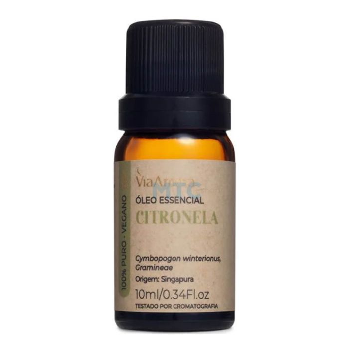 O óleo essencial de Citronela é produzido pela empresa Via Aroma e está disposto em um frasco de vidro contendo 10ml. O óleo essencial de Citronela, auxilia nos problemas reumáticos, entorses e dores musculares. Possui ações antissépticas, germicida, fungicida, potente contra insetos e auxilia na eliminação de pulgas que se instalam nos pelos dos animais. Características: