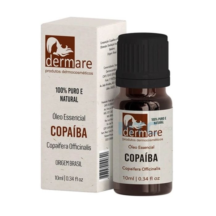 O óleo essencial de copaíba é produzido pela empresa Dermare e está disposto em um frasco de vidro âmbar contendo 10ml. O óleo essencial de copaíba, tem ações anti-inflamatórias é antisséptico e cicatrizante natural. É indicado para acelerar o processo de regeneração dos tecidos da pele. Características: