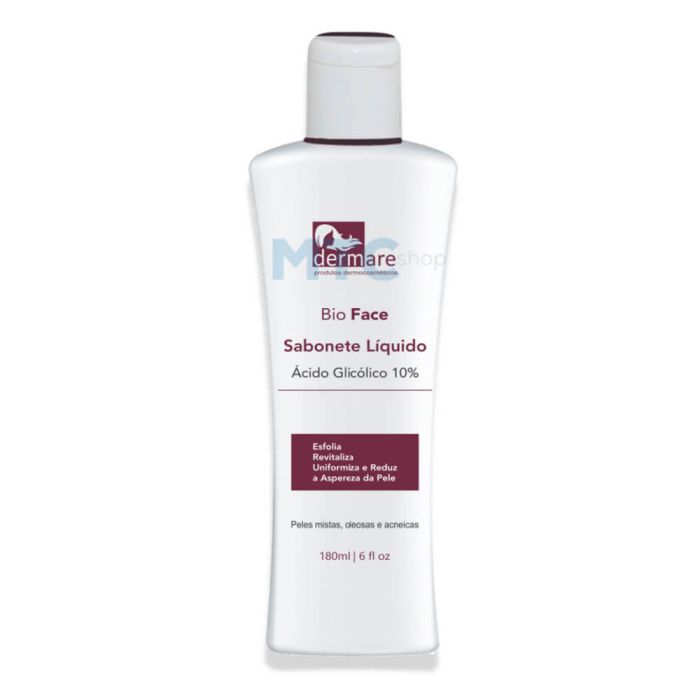 O sabonete líquido foi desenvolvido pela empresa Dermare e está disposto em uma embalagem plástica com 180ml. É um produto multifuncional, em sua formulação possui ácido glicólico que promove intensa limpeza sobre as camadas da pele. O sabonete líquido bio face tem ação revigorante e auxilia nos procedimentos de limpeza de pele. Características:
